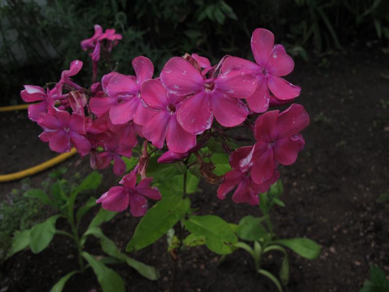 Von dem violetten Phlox vor 'Uspech' hatte ich vor gut 10 Jahren ein paar Pflanzen gekauft, inzwischen sind die Horste beachtlich. Vorigen Sommer schon hatte ich den Eindruck, daß die Blütenrispen früher größer waren und hab ein paar geteilt, mal sehen. Er hat elegante dunkle Stiele und vollkommen gesundes frischgrünes Laub. Leider verblaßt die Farbe auf seinem Sonnenplatz rasch, am schönsten ist er in der Vase. Dieser und der alte Rosa-Weiße haben den stärksten Duft.