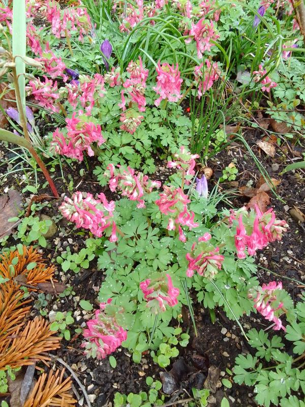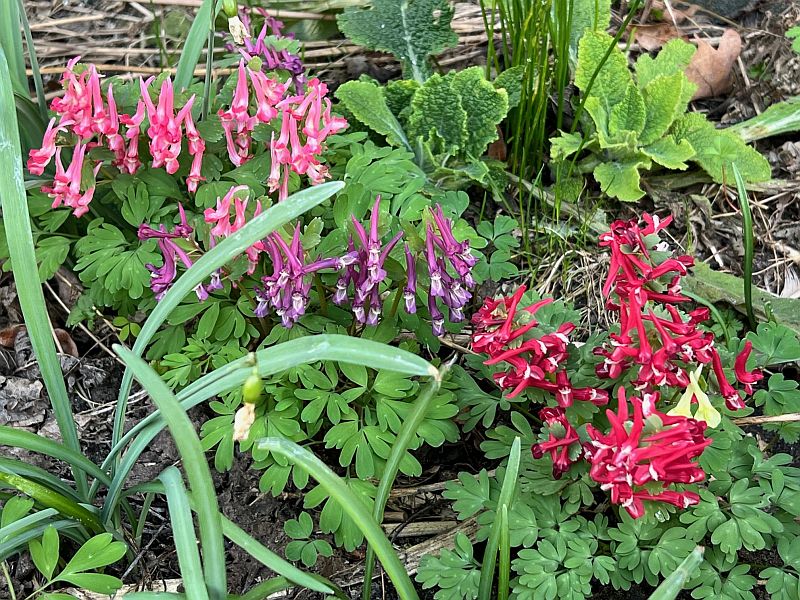 Bei Helleborus sind klare, leuchtende Farben erwünscht. Warum nicht auch bei Corydalis? Ich mag die bunten Frühlingsbilder, zumal sie so schnell wieder verschwunden sind und den Stauden Platz machen.