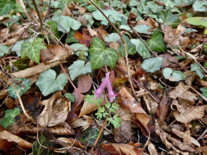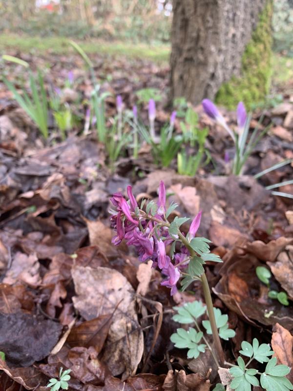 An diesem Standort der sehr Winter schattig ist blüht Corydalis vor den elfenkrokussen (im Hintergrund) und narcissus pseudonarcissus lobularis