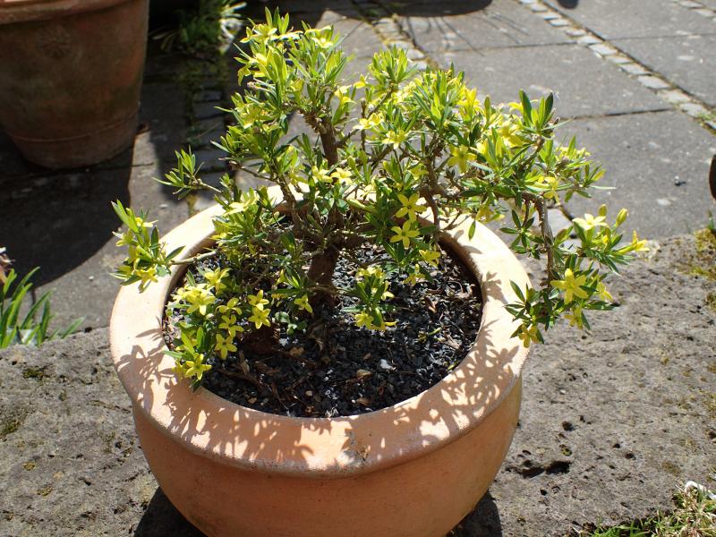 Hier D. modesta im Topf. Sie wächst dann von allein Bonsai-artig. Zusätzliches Schmankerl: Sie sät sich gerne aus. Allerdings lassen sich die Sämlinge etwas schwer groß ziehen.