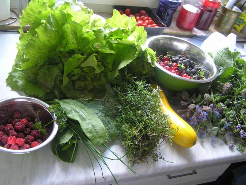 ich habe gestern auch zugeschlagen.- 2 romanasalate, 1 gelbe zucchini und ein kräuterstrauss für den mitzubringenden geburtstagsessensalat.- bohnenkraut für oma- schüssel mit sauerkirschen, jostabeeren und himbeeren zum zwischendurch naschen beim geburtstag- blumenstrauss aus kräutern (borretsch, oregano, minze, majoran)das rote in den gläsern rechts hinten auf der fensterbank wird johannisbeeressig