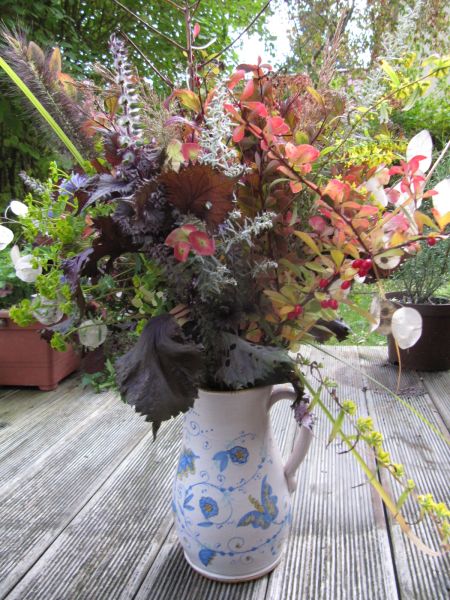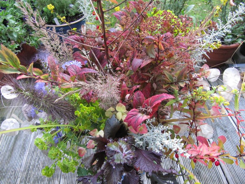 Mir ist aufgefallen, dass ich noch vor ein paar Jahren viel häufiger etwas aus dem Garten ins Haus geholt habe. Schade drum.Gestern aber beim Jäten fiel mir erst die Berberitze ins Auge, dann andere gerade färbende Gehölze und Stauden. So habe ich kurzentschlossen einen Strauß der schnellen Vergänglichkeit geschnitten. Er ziert jetzt den Terassentisch, in der warmen Wohnung wäre die Pracht ja leider noch viel schneller vorbei. Hier die Draufsicht.