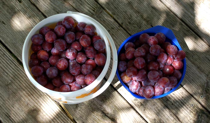 So viel konnte ich leider noch nicht ernten,aber jetzt habe ich auch mal was: Pflaumen (oder sind´s Zwetschgen?).Der Ernteort ist etwas mühsam, der mehrtriebige Strauch/Baum wächst direkt am Fußweg (Kreuzung). Entweder sind die Schüler schneller oder wenn der Wind um die Ecke pfeift, haben die Pflaumen ein Reifenmuster. Und gleich wird Kuchen gebacken