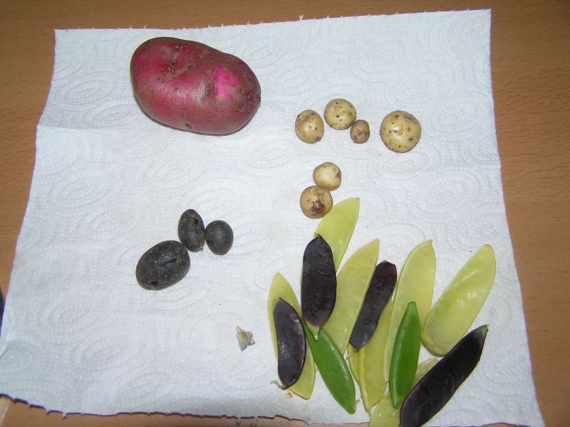 heute die ersten zuckererbsen. blau gelb und grün. ein händchen voll.ebenso meine krautfäulegeplagten kartoffeln rausgerissen.davon 1 große kartoffel geerntet und ungefähr 6 murmelgroße....und das von 8 pflanzen...seufz...achja, kopfsalat, diverse kräuter und die ersten 3 tayberries.