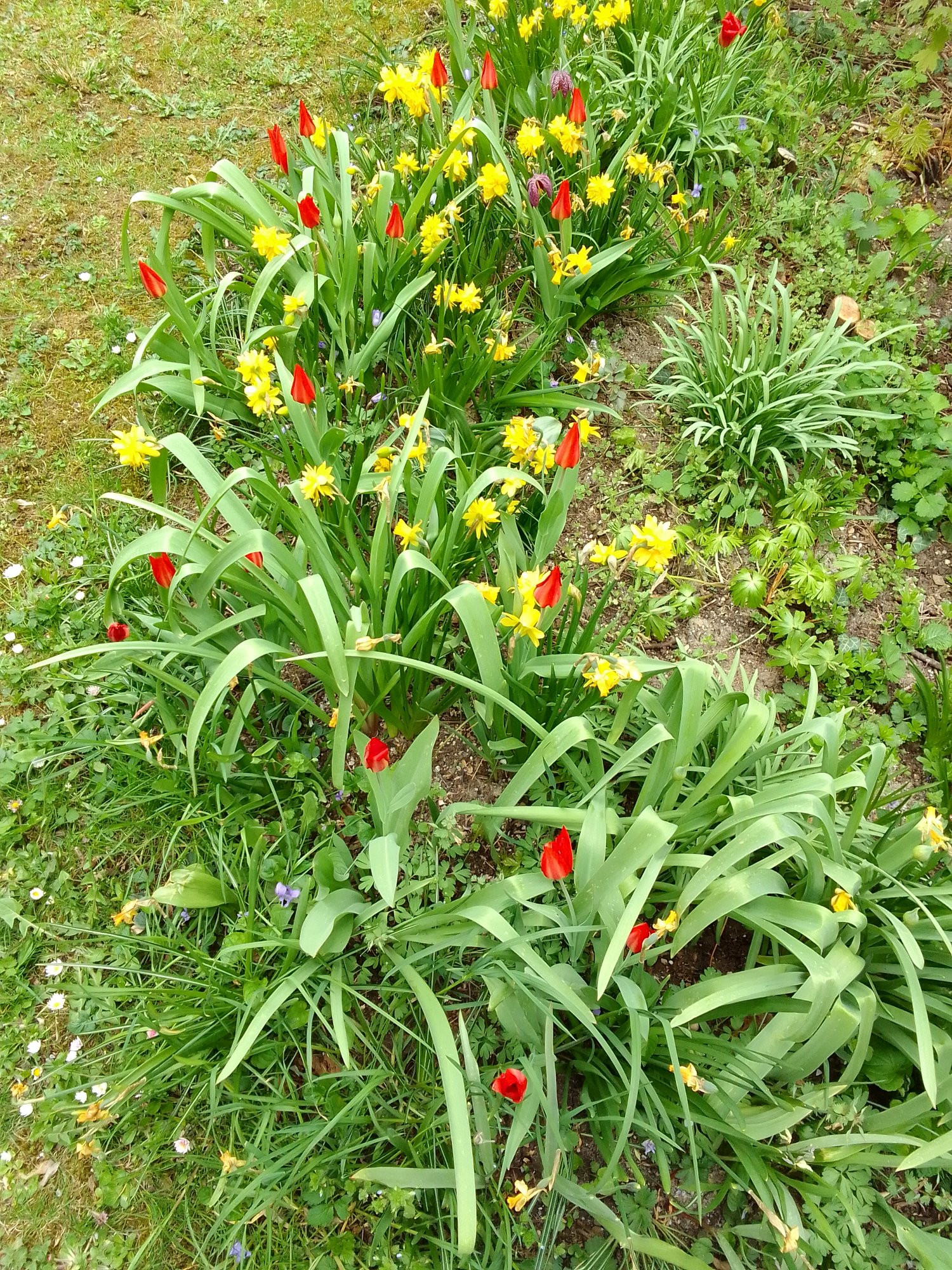 Buntes Allerlei in der Baumscheibe: Primeln und Narzissen.