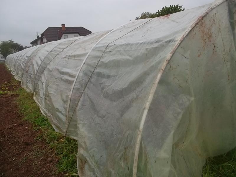 Das war heute eine Heidenarbeit. Wir haben bei Regenwetter zu dritt die Folie wieder auf den 50m-Tunnel aufgezogen, damit die Tomaten geschützt sind. Zum Glück war es windstill, am letzten Donnerstag haben wir es schon mal probiert sind fast wie Drachen davon geflogen.