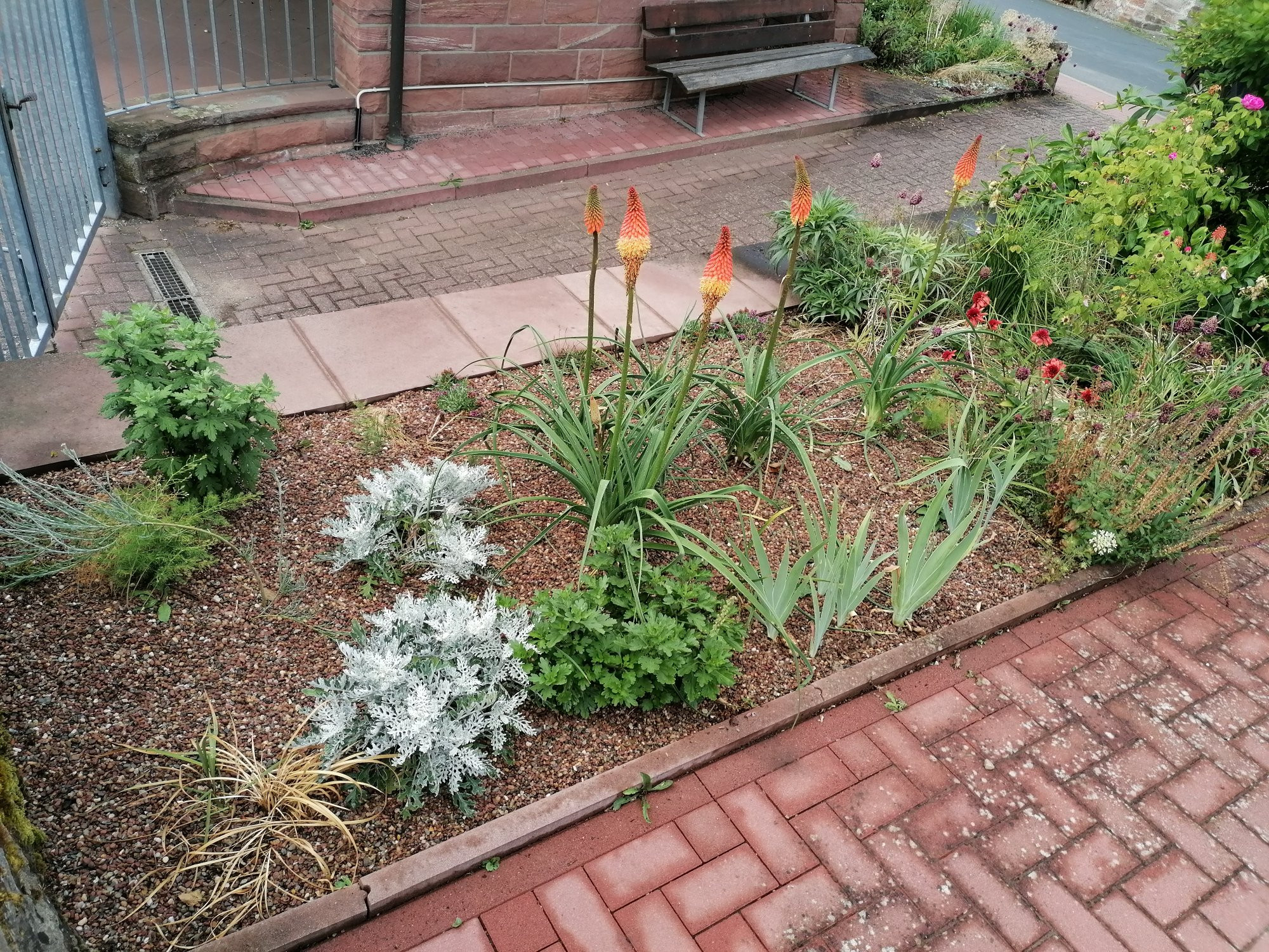 An unserem Friedhof, im April neu bepflanzt. Hab zum Glück einige Gießkannen hingeschleppt. Das wird