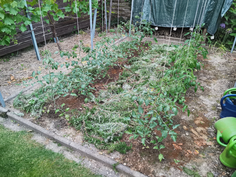 Bin zureuckgeworfen worden duch naechtliche Besuche eines Tomatenmoerders (Waschbaer, Dachs, Marder?) der durch eine Luecke im Zaun reinkam und sich in 2 Regennaechten buddelnd und lagernd so ueber die frisch gesetzten Tomaten gemacht hat, dass von 12 nur noch 1 ungeknickt stand. Ob es am Dach lag oder an der Schafswolle im Pflanzloch, die gelockt hat?