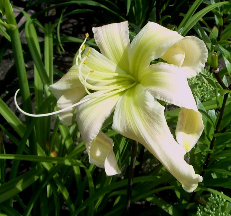 Trotzdem war ich vormittags "on Foto-Tour" und habe unter anderem den dieses Jahr spät erblühten Sämling 'Curly Krücke' erwischt... bodenlägerig wie eh und je, da geht ohne Stützstab wirklich gar nichts. Er hat jedoch noch einen weiteren Stiel, der deutlich stabiler aussieht, also abwarten. Da dieses Jahr jedoch ohnehin alles im Ausnahmezustand ist, wird die abschließende Entscheidung über sein weiteres Schicksal wohl erst im kommenden Jahr fallen. Bis dahin kann er noch ein paar schöne Foto-Motive liefern, denn fotogen ist er allemal.