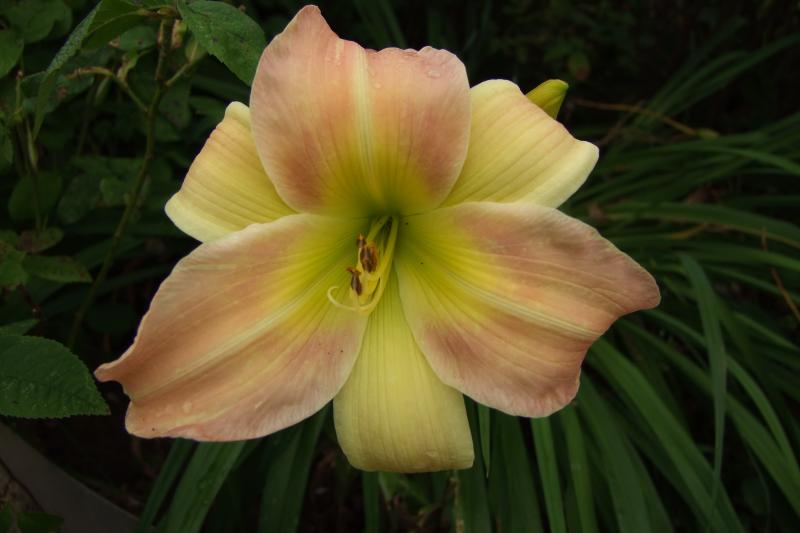 Es regnet.....nein, es schüttet !Eine kleine Atempause vom morgendlichen Blütenausputzen :)Da zeige ich doch mal einen Sämling, der mich sehr überrascht hat.Ich bin ja kein Züchter und grabsele kreuzungsmäßig noch im Anfängerstadium. Da klappt einiges mal nicht so - und so gab es in 2013 kaum Samenkapseln.Geerntet habe ich dann alles, was an den Stielen hing, eben auch "natur-gekreuzte" - Vater unbekannt.So eine Krezung ist Spacecoast White Out mit