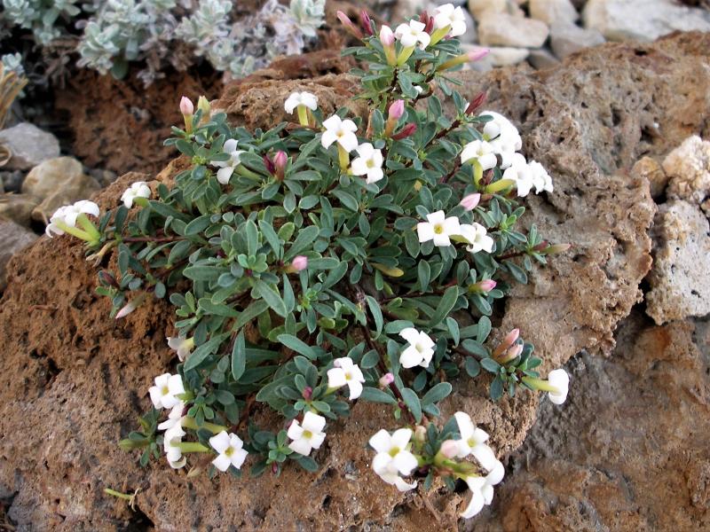 Die kriechende Form (Delphi-form) von Daphne jasminea hat sich nach einigen Jahren in Kalktuffstein gut etabliert. Im Unterschied zu allen anderen mir bekannten Seidelbasten ist er ein unermüdlicher Dauerblüher mit rosa Knospen und wunderschönen reinweißen Blüten über grün-grauem Laub. Nachteilig ist der fehlende Duft und natürlich die fragliche Winterhärte.