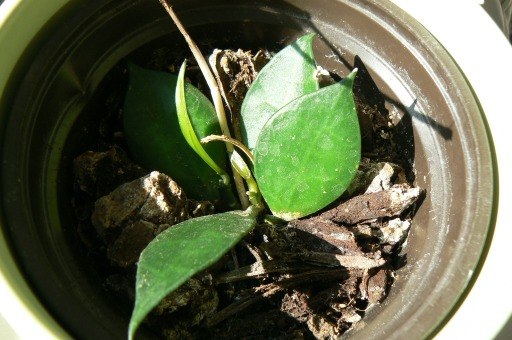 Im Winter hat mir ein lieber Gartenfreund eine Hoya gebracht in der Meinung, bei könne sie gut gedeihen. Den Namen kennt er nicht, aber sie soll gut duften. Nun ja, so richtig gefiel es ihr nicht bei mir. Ich vermute inzwischen, dass es ihr im "Pelargonienzimmer" schlicht zu kalt war (oder zu extrem: tagsüber sonnenwarm, nachts recht kalt).Wie auch immer, sie begann abzusterben. Zum Schluss blieb ein Stückchen übrig, mit einigen wenigen gelblich-grünen schrumpeligen Blättern. Ich habe dieses Stück neu getopft - in Orchideensubstrat und all die Monate feucht gehalten. Nach und nach nahmen die alten Blätter wieder eine gesunde Farbe an und strafften sich. Und nun dies: sie treibt durch