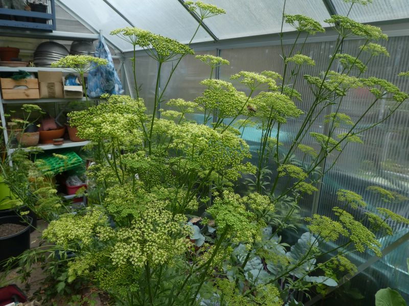 Im Gewächshäuschen blüht seit Wochen die Petersilie. Es duftet sehr und natürlich herrscht ein emsiges Hin- und Herfliegen.