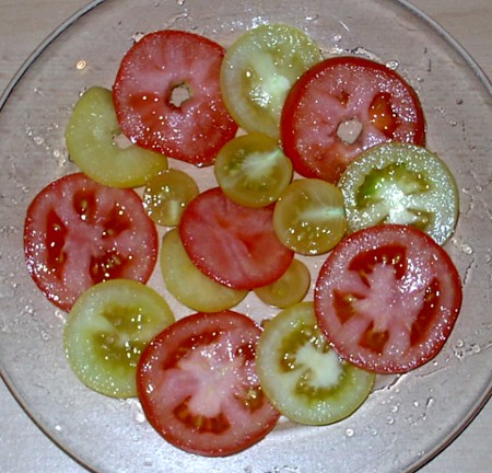 ;DEs ist endlich wieder ein goldene Königin und erstmals eine Rentita reif geworden ebenso ein paar Coctails.Bei der Rentita kann man schön sehen, dass sie das Wachstum schon lange eingestellt hat und nur noch die Früchte ausreift. Die anderen Tomatenstöcke streben immer noch in den Himmel, manche haben schon die 2 Meter Marke überschritten.Aber die ausgefallenen Sorten lassen immer noch auf sich warten :-\Anbei ein Foto von einem kleinen Tomatenteller aus der heutigen ErnteGruß Karin