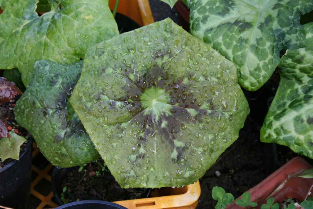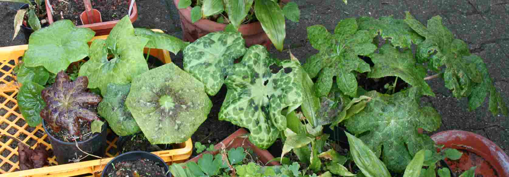 Hier sind schon fast alle Podophyllums entfaltet. Eine ganze Reihe werden dieses Jahr auch blühen, dann kreuze ich wieder. Leider habe ich kein reines delavayi mehr, die haben den Umzug nicht verkraftet. Hat hier vllt. jemand ein paar Pollen für mich, so in ca. 4 Wochen?Hier ein paar Bilder, ganz links und ganz rechts versipellexdelavayi, dann pleianthum (hinden), versipellex'Spotty Dotty' und Kaleidoscope.Das Schöne an den Hybriden ist auch, dass sie mehr Blätter machen als die reinen Arten und auch im Sommer nochmal Blätter nachtreiben - so kommen sie schnell zu Kräften. Der erste versipellex'Spotty Dotty' hat dieses Jahr Blüten angesetzt - mal gespannt ob die Kreuzung fertil ist!