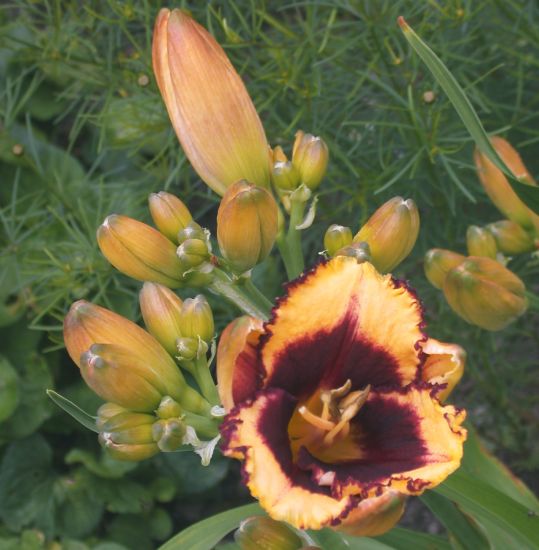 Dagegen bin ich auch im dritten Standjahr verärgert über die vegetativ vermehrte EYE ON AMERICA, von der ich noch nie eine flach geöffnete Blüte gesehen habe.