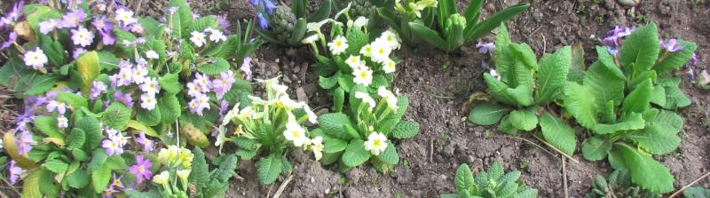 Sie leben in unserem Klima nur bis zum nächsten härteren Winter, hinterlassen aber ihr "Blut" in den nachkommenden Sämlingen. Mit den Einmischungen der westeuropäischen, blassgelben und der ausgepflanzten Pott-Kissenprimeln kommen immer wieder pastelfarbene Typen zustande (im Bild unten dunkler als real). Das ist die Ecke, in der sie mal gestanden haben.