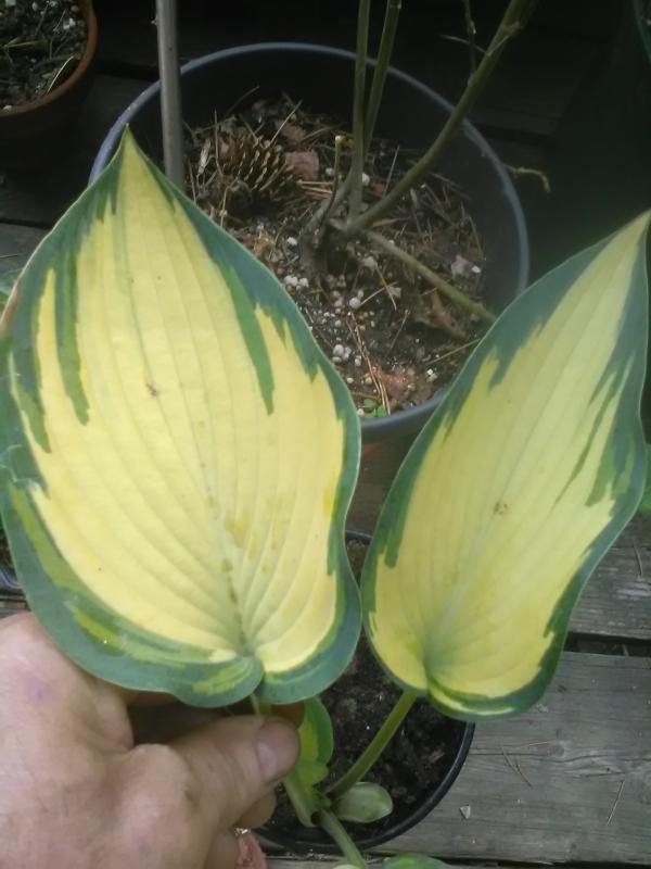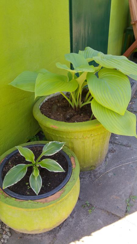 Ich hatte sie gepflanzt, als ich gerade die Hütte gestrichen habe und große Freude daran, meinen Mann 10 Sekunden glauben zu lassen nicht nur der Topf auch die Hosta hätte nen Anstrich bekommen... ;D