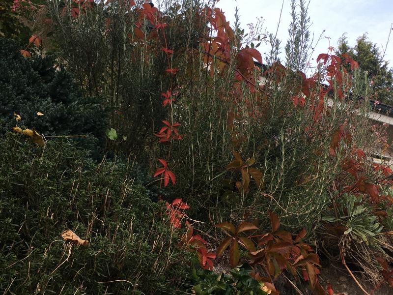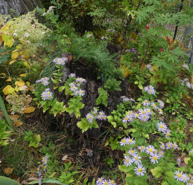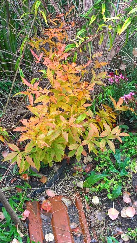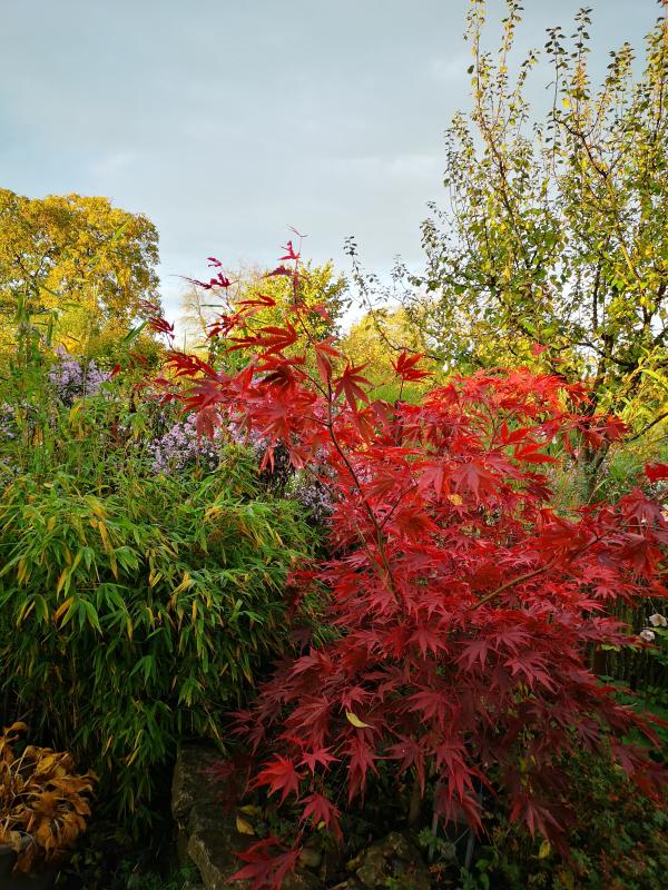 In unserem Garten leuchtet ein Ahorn, hier zusammen mit Aconitum .