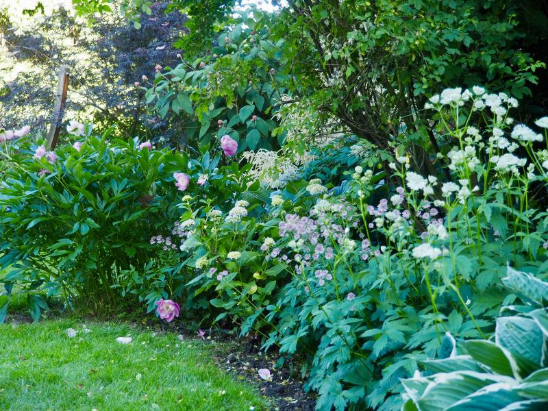 Und die Phalanx der Schattenstauden reiht sich auf, verschiedene Sterndolden, Funkie und Hortensie endless Summer.