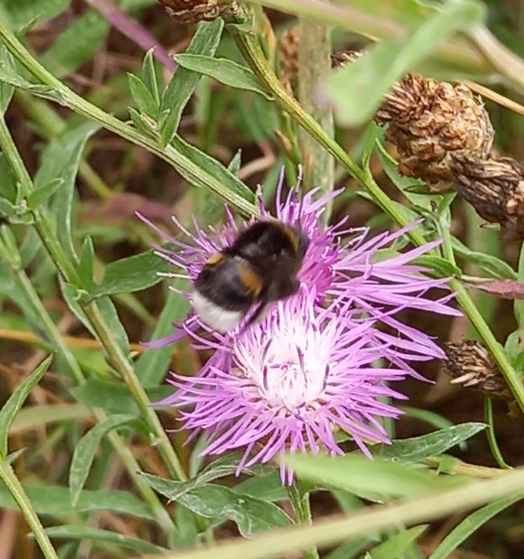 An Scabiosa columbaria sammelt immer noch eine kleinere Halictus- oder Lasioglossum-Art. Dabei handelt es sich ja meist um soziale Bienen, wildbienen.de dazu: