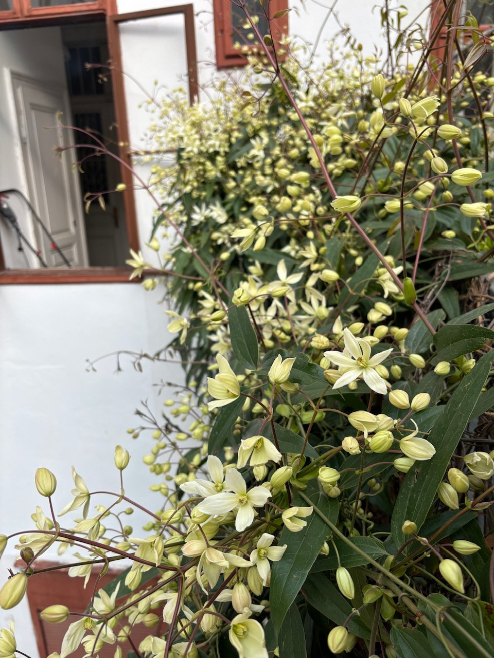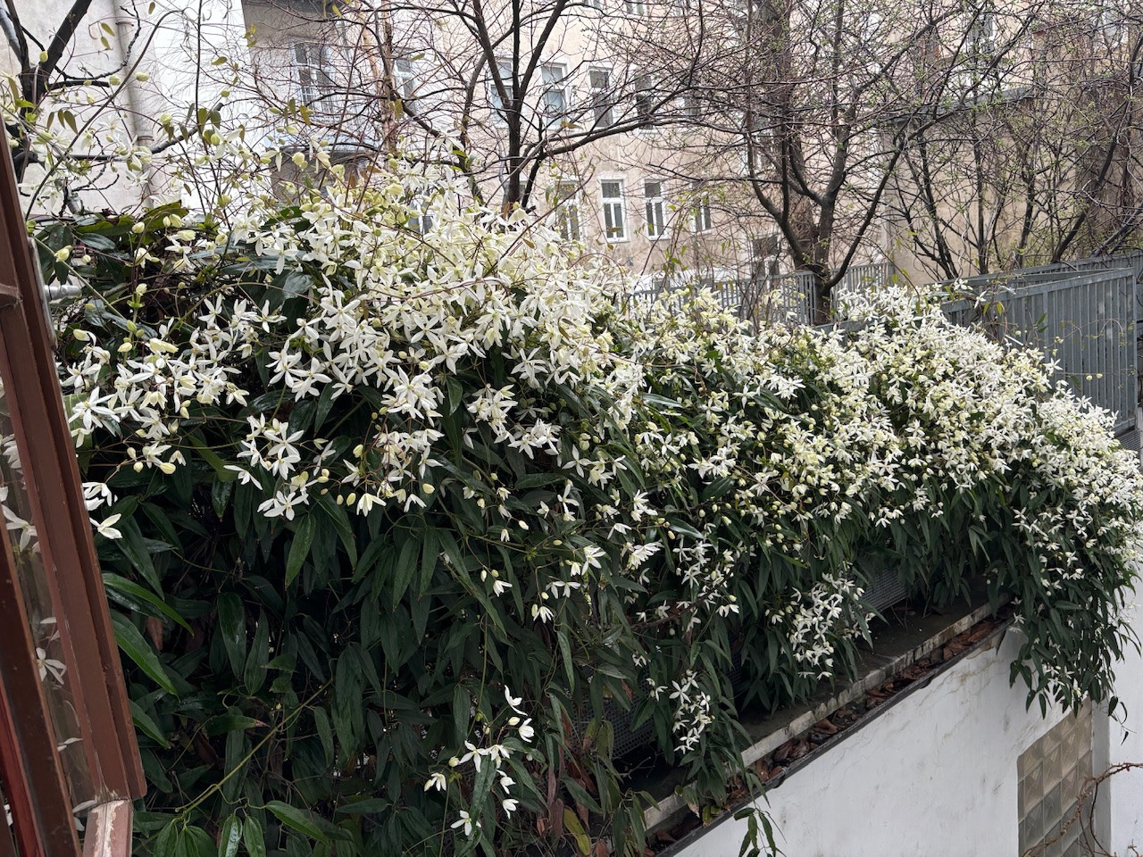 Hinten werde ich die C. armandii heuer doch ein bisschen zurückschneiden, damit die Regenrinne gesäubert werden kann. Die Hausverwaltung hat mich mit der Firma vernetzt, die das machen wird. Damit ich ihnen auf die Finger schauen kann
