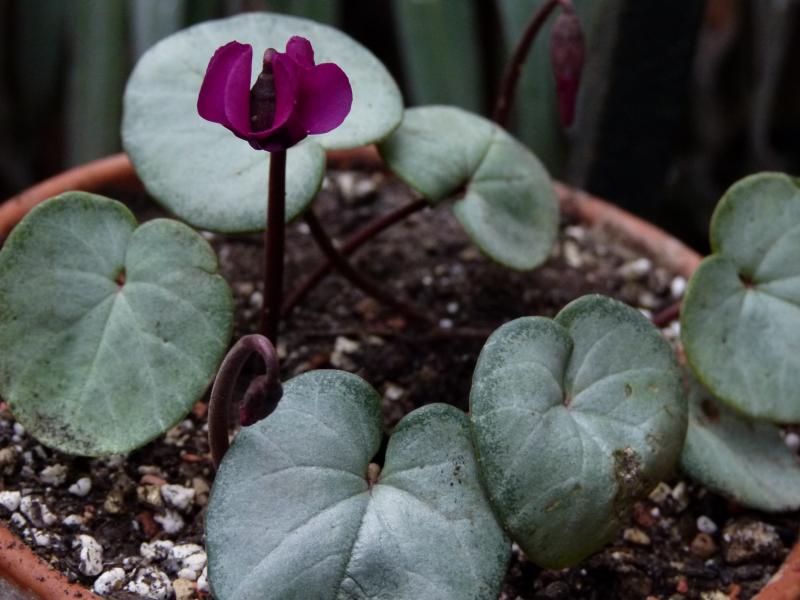 ein C. coum-Sämling: silberlaubig mit sehr dunkler Blüte: