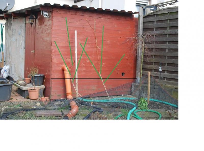 Ja das geht natürlich theoretisch aber da ist doch der Eingang.....Oder nicht?mein plan b war eigentlich, die eine rebe um die ecke zu ziehen, vielleicht teilweise, also nach links und die andere rebe an dieser wand. geht so etwas? an den bretterzaun vom nachbarn kann ich nicht ran gehen.es ist nur an der einen wand, wo die reben stehen, erde. auf der anderen seite ist pflaster. deshalb stehen beide nebeneinander.die seite der hütte ist der schönste und sonnigste platz im garten.