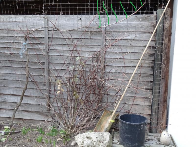 Jetzt würde ich so schneiden,erste Auge ca 10cm unter dem Draht .Der erste Draht ca 60-70cm vom Boden...vielen dank dietmar für deine ausführungen.die reben habe ich im letzten frühjahr gesetzt. bei der hellen traube habe ich mich geirrt, es ist palatina.lt jakob sollten die reben im ersten jahr so treiben, dass sie mindestens bleistiftdicke haben. das haben sie. :)auf dem foto sieht man den aktuellen zustand der reben und der hütte. palatina ist rechts, sie ist an der hütte angebunden.die chevchenko ist die linke und könnte um die ecke wachsen. die reben stehen ein stückchen weg von der wand, aber ich habe sie schräg an die hütte wachsen lassen. bisher sind noch keine seile gezogen. das muss ich noch machen. ich dachte da an 2 querseile übereinander. wäre das ok? oder müssen es 3 sein?die seile könnte ich auch um die ecke ziehen.
