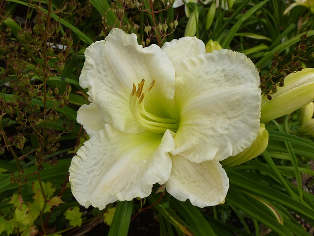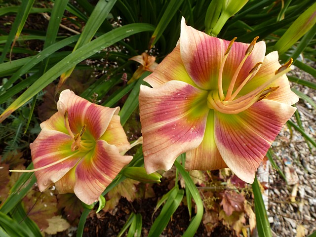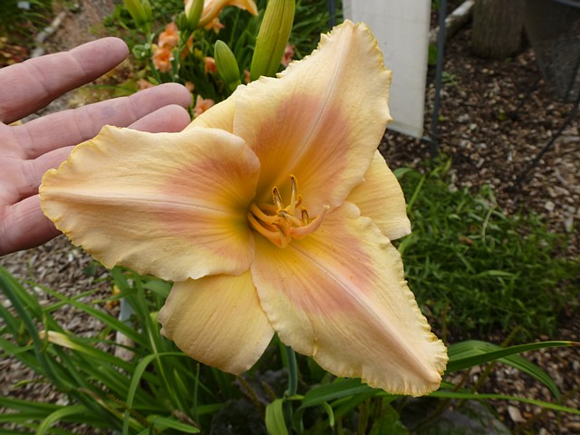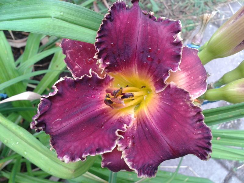 Wunderschön. Dip oder Tet? Weißt du die Eltern?Unten Randy Stephens x Thistles and Thorns. Wie man sieht regenfeste Farbe. Alle meine Sämlinge aus Thistles and Thorns sind recht gut geworden.@ Martina777: Ich fürchte, das ist eher das verblichene Rostrot von Heavenly Beginnings als Violett. Ich habe sie dieses Jahr mit starkfarbigen Blüten gekreuzt, ich meine aber, sie hätte als Mutterpflanze keine Kapseln gebildet.Auf jeden Fall einen sicheren Platz wird hier dieser Sämling behalten.So ein grüner Schlund und steht mit einer Faust, trotzdem es wieder arg windig ist.