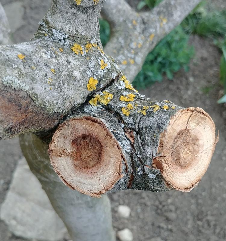 Ich hatte im letzten Frühling viele Äste stark zurück geschnitten, um den Neuaustrieb und die Feigen wieder weiter unten zu haben. Aufgrund feuchter Witterung und einer (vermutlich) zu spät erfolgten Behandlung der Schnittstelle mit Wundverschluss war es zu einer Infektion eines der starken Leitäste mit dem Pilz Diaporthe cinerescens gekommen, der Nekrosen auslösen kann. Ich dachte in weiterer Folge ausreichend betroffenes Holz und darüber hinaus eliminiert zu haben, dem war aber offenbar nicht so: heute Abend sah ich, dass der komplette Ast (Durchmesser bis zu ca. 5 cm) und ein weiterer befallen und komplett tot waren.