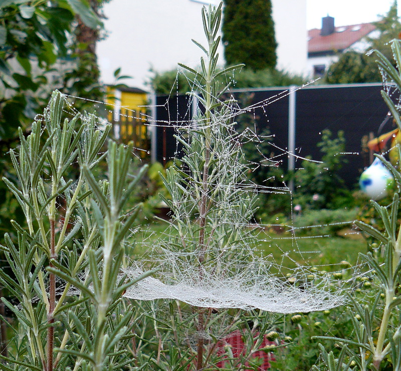 und ist in Deinem wirklich tollen Foto ganz gut zu sehen > der dunkle Fleck und die helleren Beine unten an dem waagerecht gesponnenen Netzteil. (Es gibt zur Zeit jedenfalls nur wenige andere Spinnenarten in solchen Netzen.)