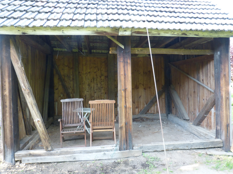 Danach ging alles recht zügig (das näherrückende Offene Gartenwochenende spornte meinen Holzwurm an - er wollte bis dahin fertig sein). Das Gefache wurde ausgemauert, die Tür eingesetzt und der Rest fachmännisch - natürlich mit Altholz - verkleidet.