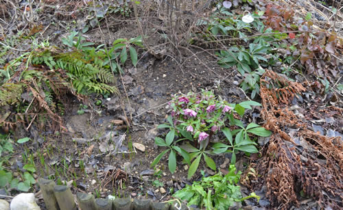 Dieser Gartenteil, hier die rechte Hälfte ist auf einer Mauer. Man kann also bestens den Hellis ins Angesicht gucken, sozusagen von Auge zu Auge! Hier waren auch die speziellen Schneeglöckchen, die stark dufteten, gleich hinter den Steinen gepflanzt. Leider hat die Katze alle rausgescharrt! >:(Im Moment liegt noch viel Laub, plus Rosenschnittholz da. Auch hier sieht es in zwei, drei Wochen ganz anders aus. Ich sagte ja, die Bilder im jetzigen Zeitpunkt, sind nicht gerade der Hammer.