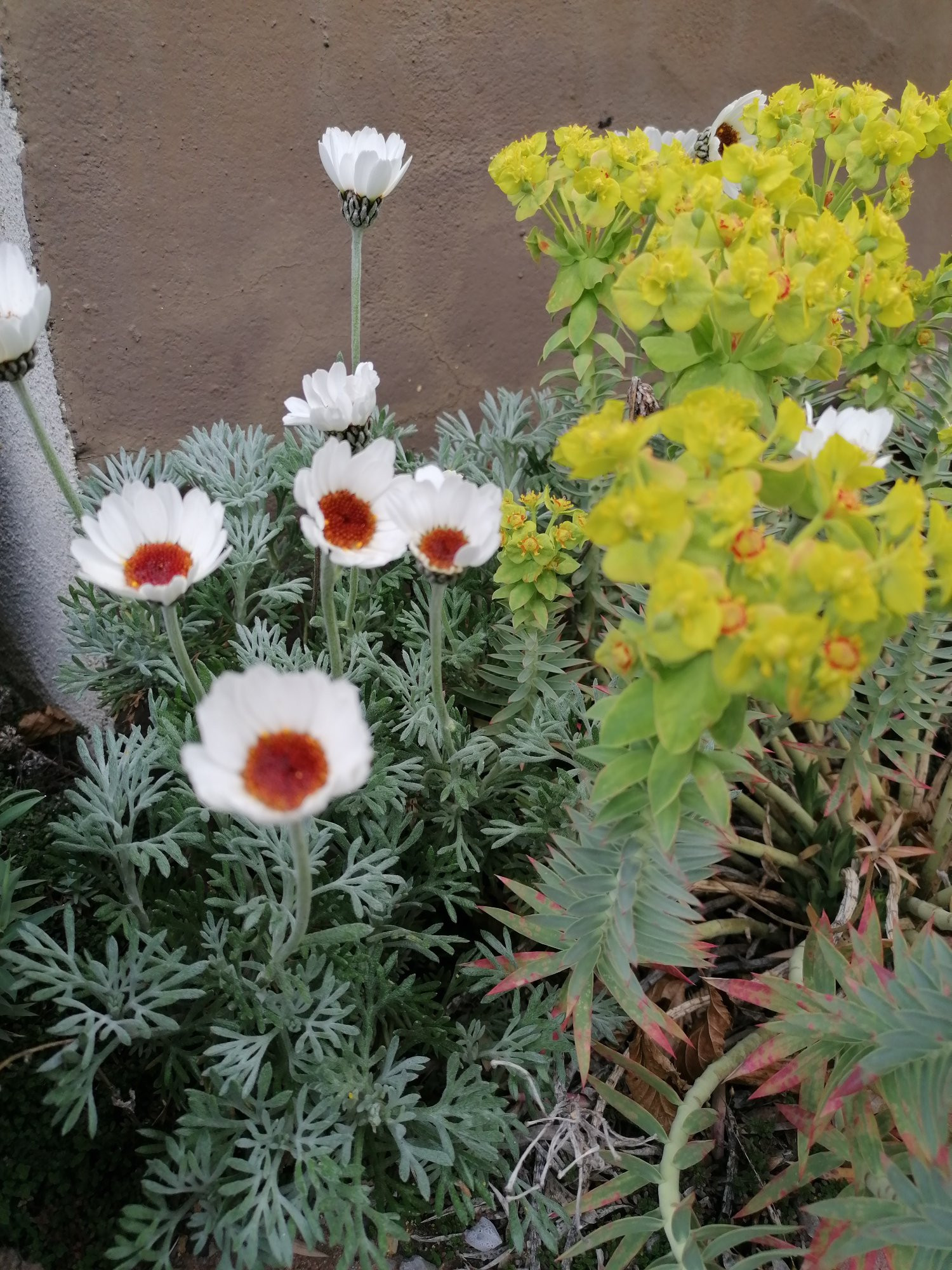 Rhodanthemum hosmariense hält direkt an der Hausmauer gut aus, zusammen mit Euphorbia rigida in einem rausgenommenen Pflasterstein