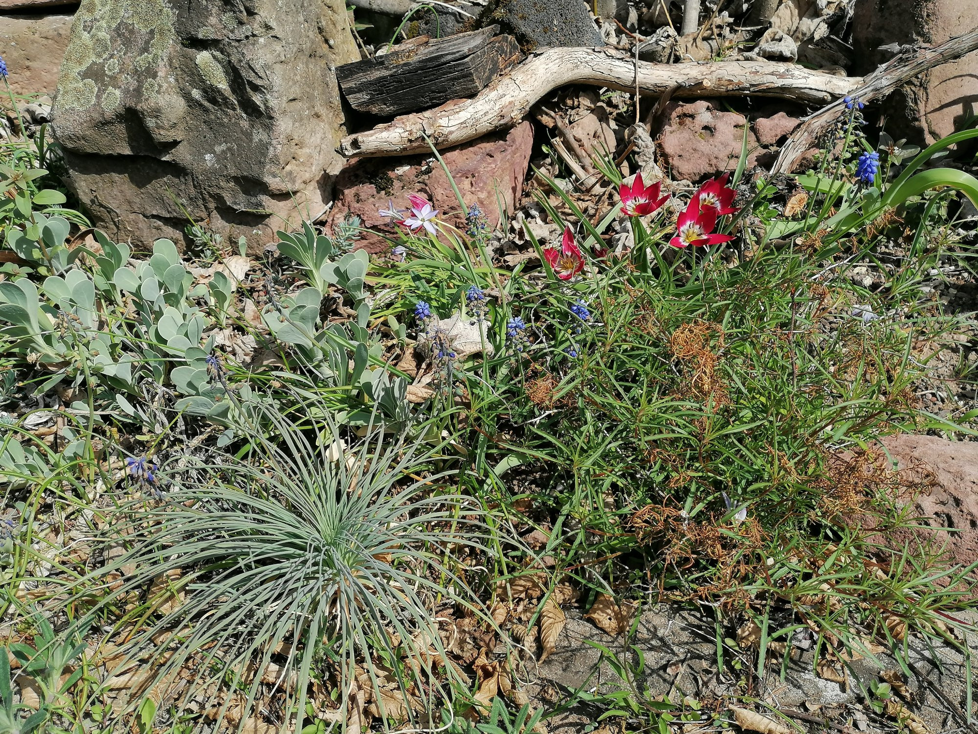 Die Wildtulpen sind momentan präsent. Hier kommt die Strauchige Nachtkerze (Calylophus serulatus) tatsächlich wieder (vorn), dazu Othonna, das graue Büschel von Asphodeline taurica und Trockenzeugs.