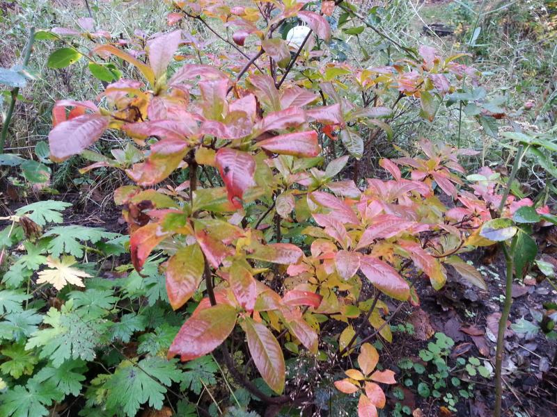 Ich erfreue mich auch von Jahr zu Jahr mehr an der Herbstfärbung der laubabwerfenden Azaleen. Und da es bei jeder wieder ein bisschen anders aussieht, gibt es ein schönes Farbspiel, wie man auch bei unserem Rhodobeet sehen kann.