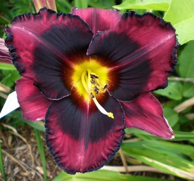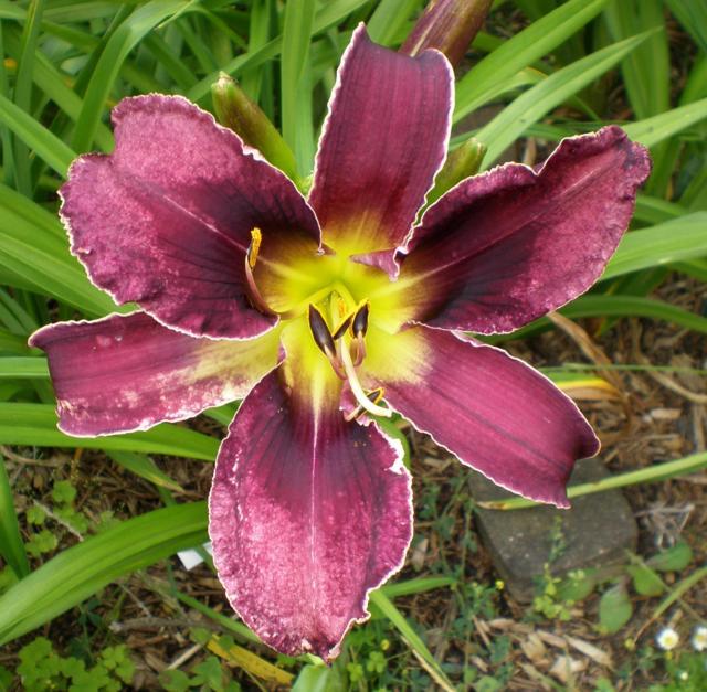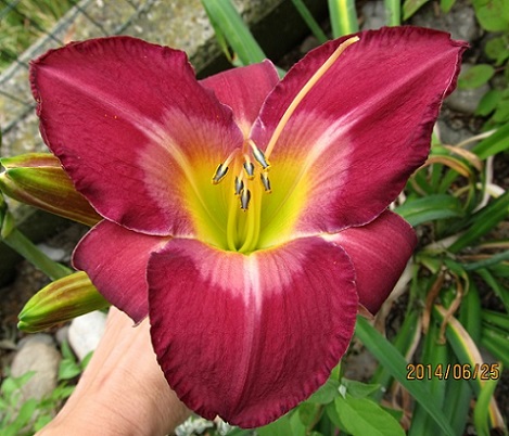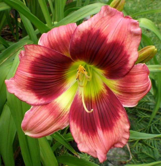 Strawberry Jazz ist eine sehr frühe Sorte - heuer neu und noch nicht akklimatisiert blüht sie erst jetzt. Die beiden unterschiedlichen Rottöne der Blütenblätter und des Auges kann meine Kamera leider nicht wirklich abbilden: