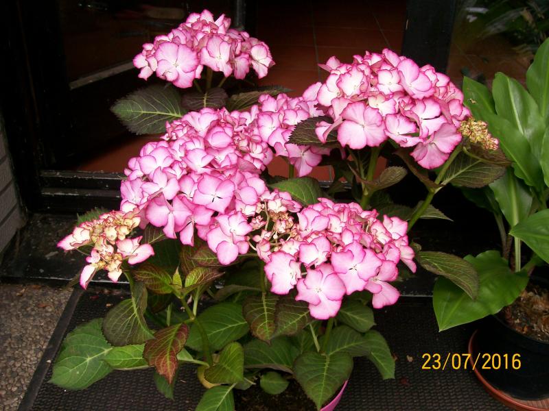 Hatte mir gerade eine schöne Hortensie gekauft. Ich war mir absolut sicher die Sorte erwischt zu haben nach welcher ich schon schmachtete, nämlich eine gewisse Macrophylla-Hybride "Love You Kiss". Das Etikett sagte dann aber: H.macrophylla "Adula rose" - also für mich sünn sö gleich. Nur 10 Euronen für das schöne Stück, dem Verkäufer sagte ich "ich habe mich gerade reich-gekauft" Ach, sooo schön: