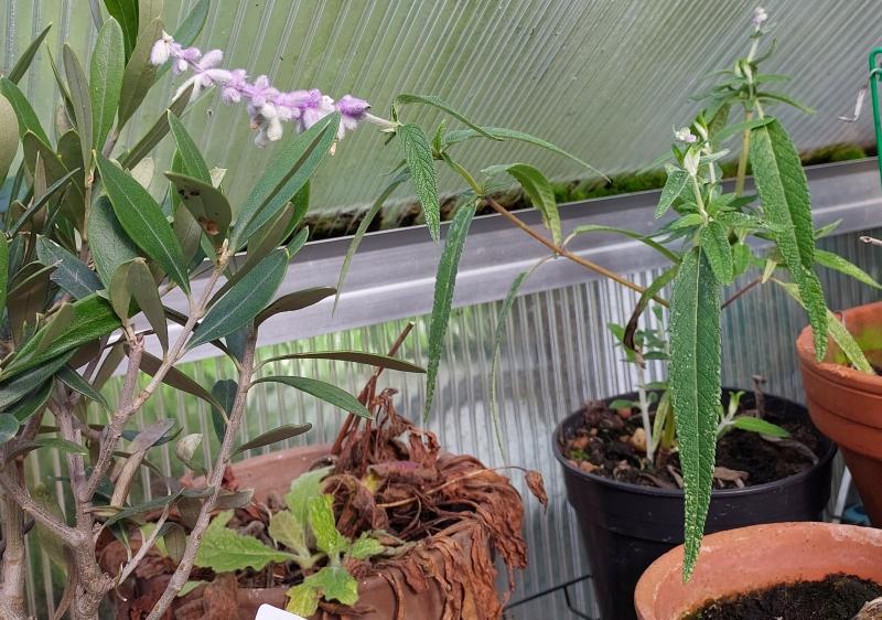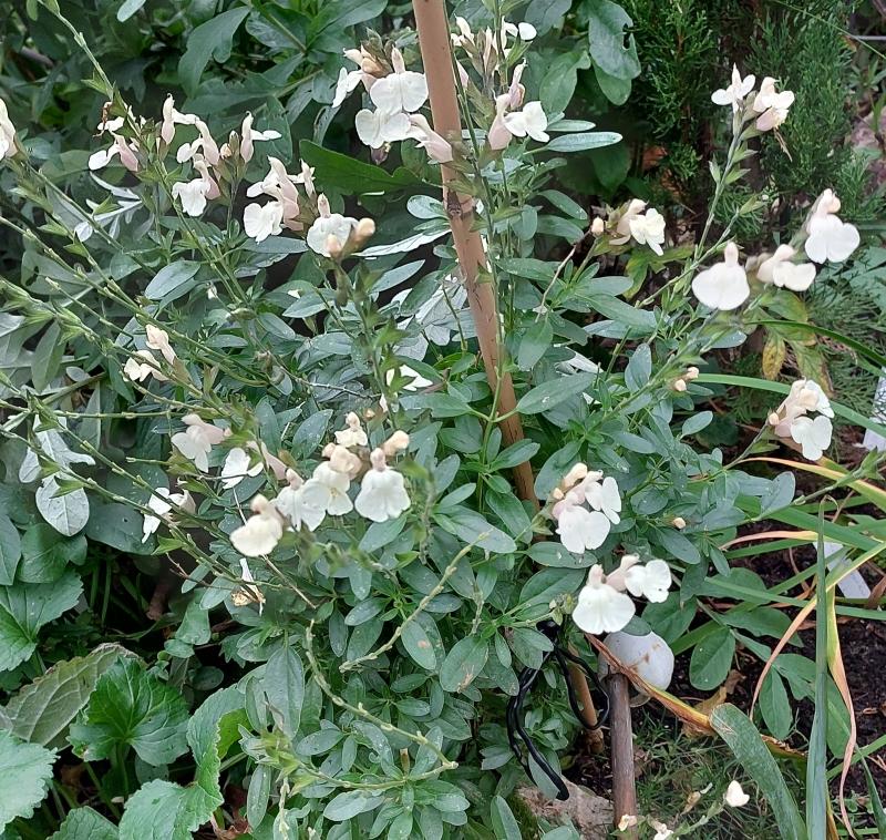 Der Steckling von Salvia Leucantha Madeira White, voll in Blüte. Auch bei nur 3 Grad wg. Stromunterbruchs. Zu schade, um sie zurückzuschneiden.