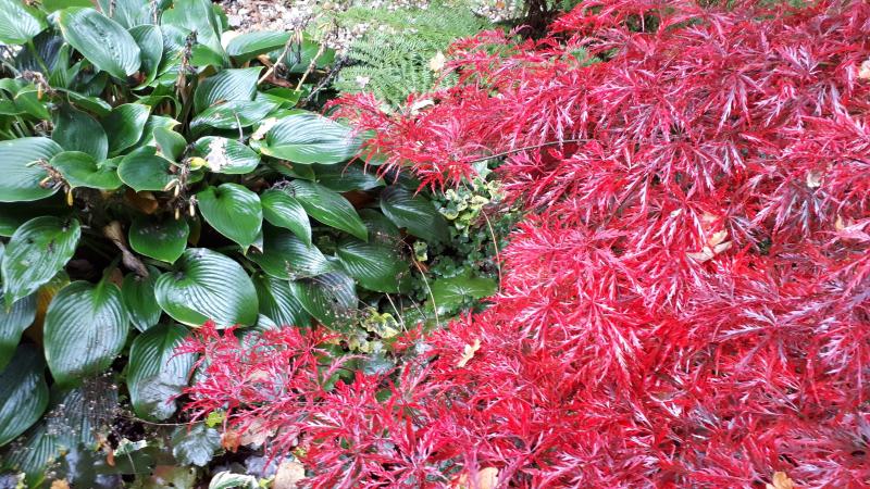 Ahorn 'Jordan'...die Färbung ist mir erst heute so richtig aufgefallen, ich war ja nicht so begeistert von ihm, weil er nicht so sonnenverträglich war, wie beschrieben, doch inzwischen hab ich ihn ausgepflanzt, evtl. geht es ihm dann nächstes Jahr besser und ich finde, die Herbstfärbung ist sehr gelungen