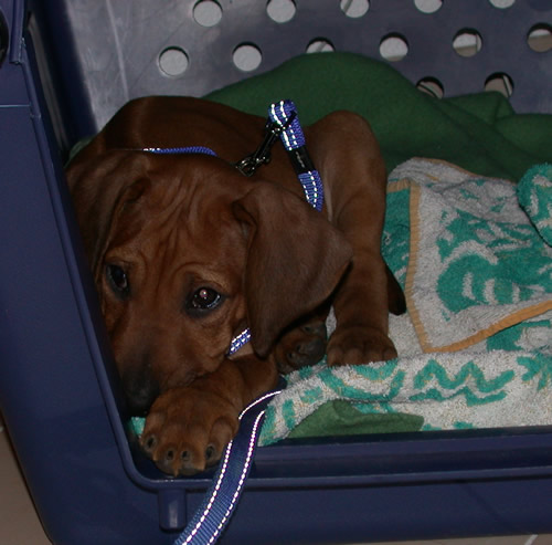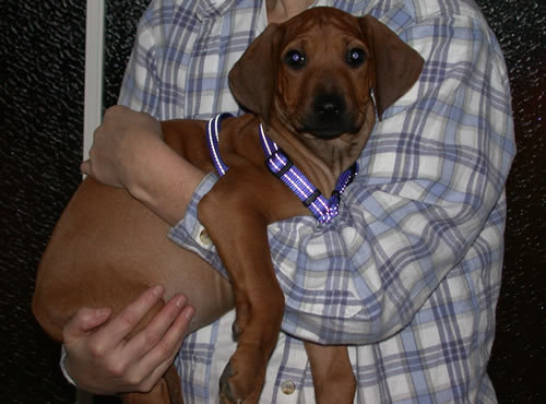Herzlichen Glückwunsch!!!! also doch ein Rhodesian geworden! Ganz viel Freude damit wünsche ich dir. Sie sieht noch etwas verunsichert aus und vermisst nachts sicher den Herzschlag ihrer Geschwister. Ein Wecker im Körpchen , der unter dem Hundekissen tickt, will da helfen, wir haben damit gute Erfahrungen gegen nächtliche "Heularien" gemacht.