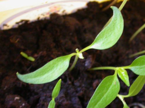 Ich muss euch auch mal einen Blick in meine Kinderstube zeigen, die zweite Partie Pfefferonis, gesät am 18. Feber, bei der Sorte Bolivian Rainbow gibts zwei 'komische Typen'Hier ein Pflänzchen mit Teufelshörnchen