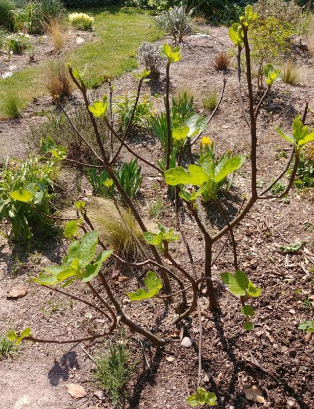 Unsere Feige hat sich nach zwei schlimmen Spätfrost-Jahren im vorigen Sommer wieder sehr schön ausgewachsen - um dann im vergangenen hier sehr kalten Winter (-17°C über mehrere Nächte) alles wieder zu verlieren. Die Neutriebe sind jetzt schwarzbraun verfärbt und trocken, das alte Holz hat leider an zwei der wichtigsten Stämme lange Frostrisse bekommen. Ob sie das Kunststück noch ein drittes Mal schafft, bleibt abzuwarten.