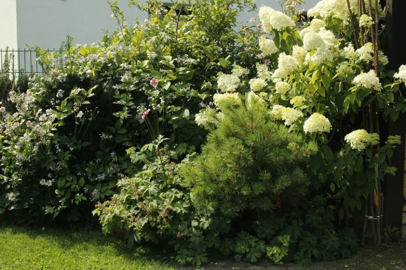 Unter der Mahonia vor einer grossen Castagnea wachsen Epimedien und Hakonechloa