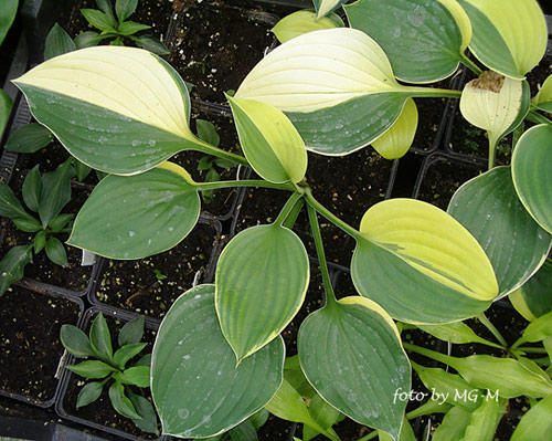 Diese Sorte ist wirklich außergewöhnlich, auch der gelbe Rand unterscheidet sich von den anderen Hostas, ist eher dottergelb.Vielleicht finde ich 'Lil Abner' ja auch mal wo