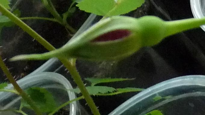 Da kann man rechts einen Sämling sehen mit heller Knospe, bis jetzt sehr ähnlich wie Primero, Mutter auch Mme Bérard, aber Vater Florence Delattre.Ganz links im Bild ist ein gakeliger Stiel mit roter Knospe erkennbar, der hier noch mal von nahem, hab's leider nicht schärfer hingekriegt.