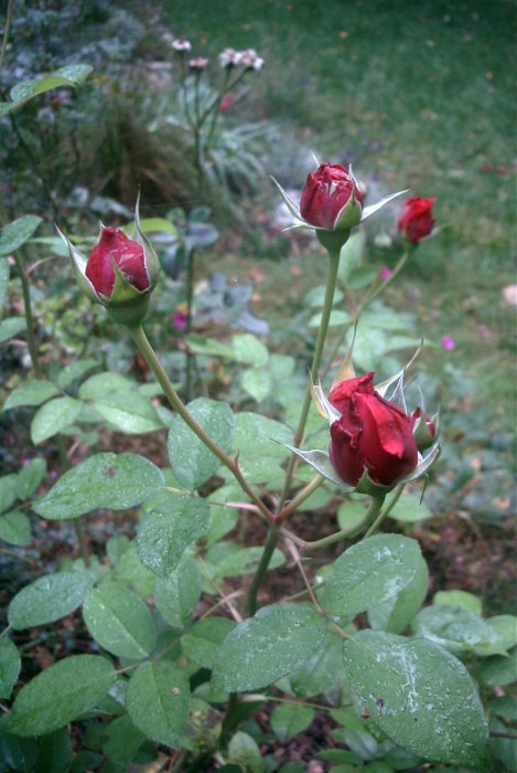 Die Mme. E. Calvat (oder auch nicht) ist zwar ein bisschen gezeichnet vom kalten, nassen Wetter, aber in den letzten 2 wärmeren Tagen hat sie doch noch einige Knospen geöffnet