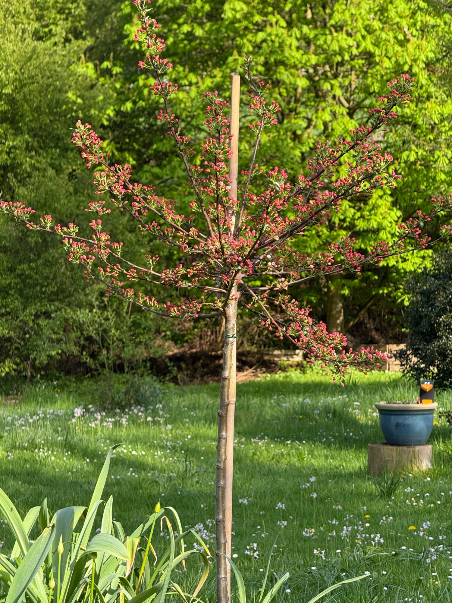 Aber auch als Begleitung für die mächtige Kastanie macht sich der Zierapfel gut.