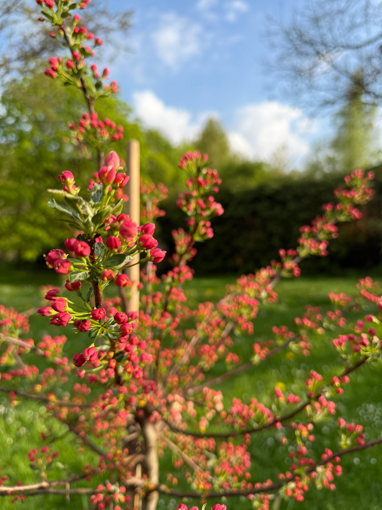 Meine Halbschattig gesetzte Tina blüht immer noch nicht aber dafür wirken die roten Knospen jetzt besser durch das Grün der austreibenden Bäumen